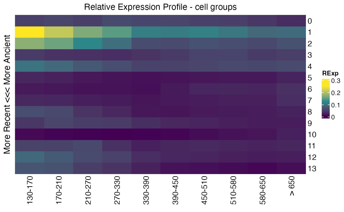 This linear transformation corresponds to a shift by \(e_min - e_max\). As a result, the relative expression level \(f_s\) of developmental stage \(s\), \(f_c\) of cell \(c\), \(f_ct\) of celltype \(ct\) or \(f_ps\) of phylotstratum \(ps\) with minimum \(e_s\), \(e_c\), \(e_ct\) or \(e_ps\) is 0, whereas the relative expression level \(f_s\) of developmental stage \(s\), \(f_c\) of cell \(c\), \(f_ct\) of celltype \(ct \) or \(f_ps\) of phylotstratum \(ps\) with maximum \(e_s\), \(e_c\), \(e_ct\) or \(e_ps\) is 1, and the relative expression levels of all other stages \(s\), cells \(c\), celltypes \(ct\) or phylostrata \(ps\) range between 0 and 1.